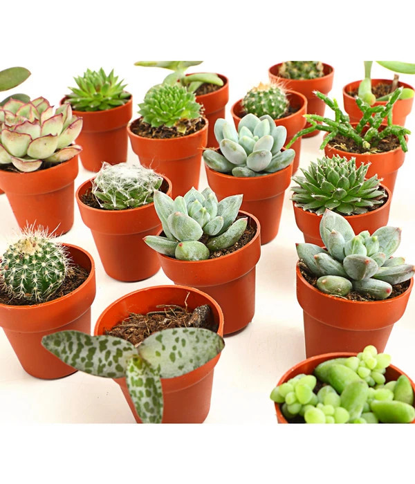 Wer sich einmal mit diesen Pflanzen näher beschäftigt hat, wird immer wieder aufs Neue fasziniert sein von ihrer oft bizarren Optik und der erstaunlichen Überlebensfähigkeit. Und als Deko-Fan werden Sie feststellen: Mit Sukkulenten und Kakteen kann man auf kleinstem Raum überraschende Effekte erzielen, ohne ihnen viel Zeit widmen zu müssen. Manche der dickfleischigen, sukkulenten Pflanzenarten eignen sich sogar als Einsteigerpflanze für Kinder, denn sie nehmen es nicht gleich übel, wenn das Gießen mal vergessen wird. Nach dem Motto ‚klein aber oho‘ bieten wir Ihnen eine tolle Mischung aus 20 Pflanzen im Mini-Format von 3-6 cm. Schon mit diesen Kleinen können Sie tollen Arrangements zaubern, die an verschiedenen Stellen im Wohnraum eindrucksvolle Akzente setzen.